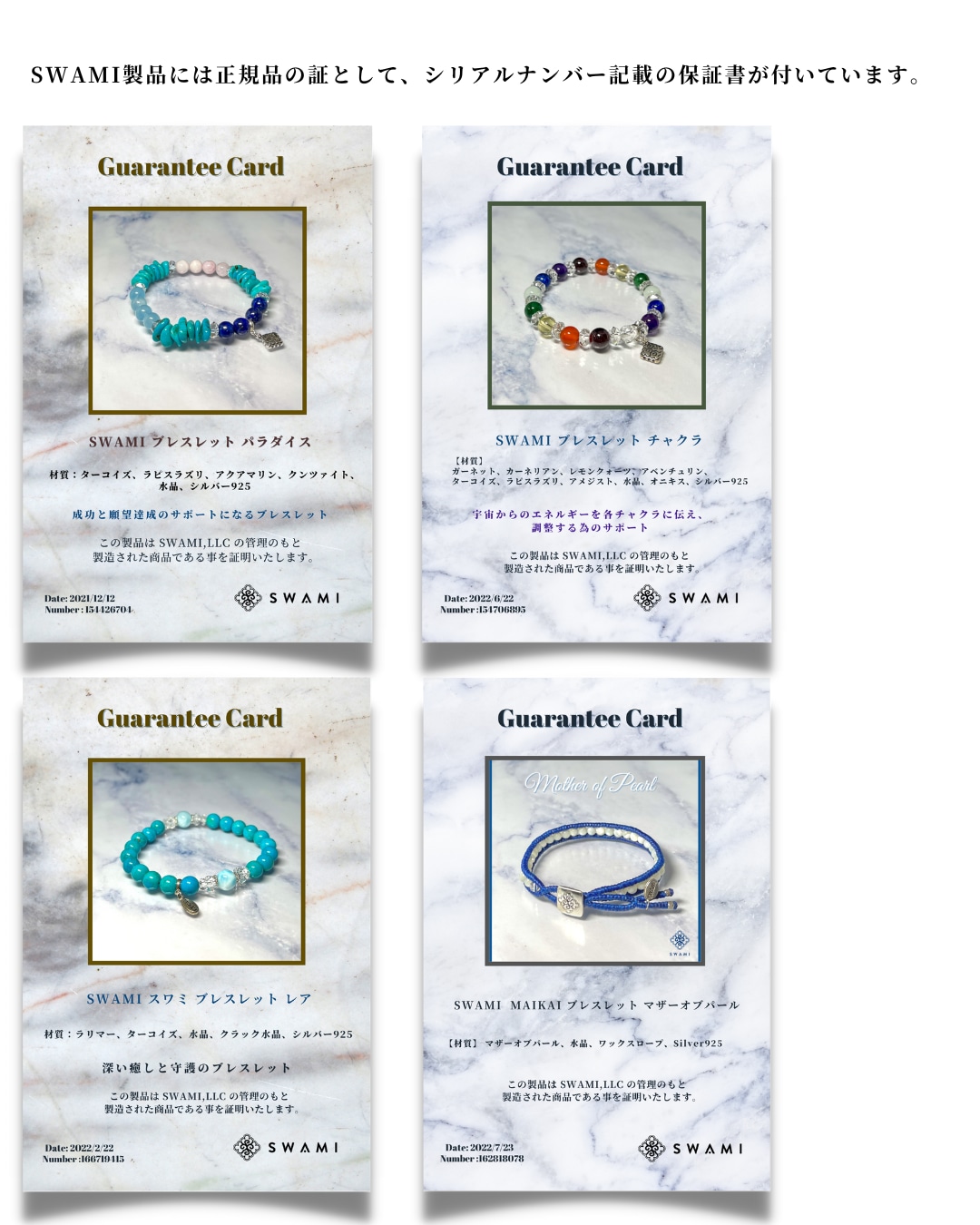 SWAMI製品を正規品として認めるために、SWAMIでは製品にシリアルナンバーを付与し、それを記載したギャランティカードを付属させています。このギャランティカードには、製品が正規品であることを証明するための製品のシリアルナンバーや製品の材質などが記載されています。