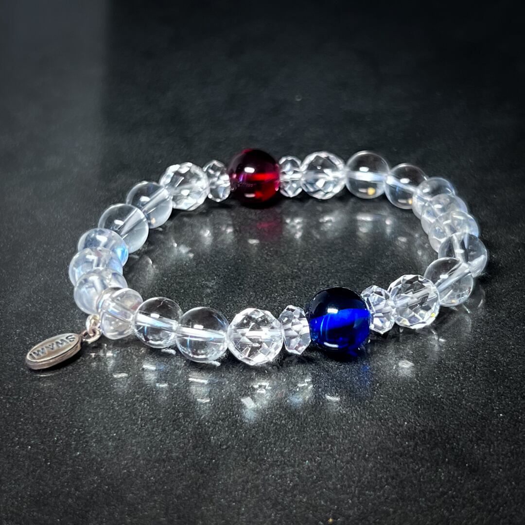 このブレスレットは、レッドアンバーとブルーアンバー、多様な形状の水晶、そしてシルバー925のSWAMIチャームが融合した特別なパワーストーンブレスレットです。