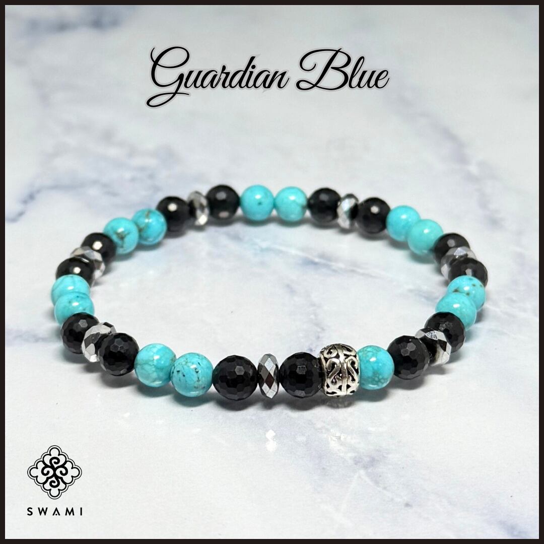 SWAMI(スワミ)ブレスレット ガーディアンブルーは、天然ターコイズの美しい色合いと、神秘的なシュンガイト、ヘマタイトさらには洗練されたシルバー925ビーズが調和した特別なアクセサリーです。このブレスレットは、独特のデザインと色彩が際立ち、身に着ける方に強い魅力と個性を与えます。